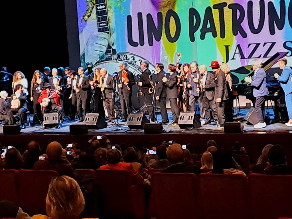 Il concerto è stato la celebrazione di una carriera incredibile, iniziata a Milano settant’anni fa, quando Lino Patruno muoveva i passi nelle prime jazz band locali. Nel 1964, diede vita assieme a Nanni Svampa, Gianni Magni e Roberto Brivio allo storico “Teatrino dei Gufi”, che fu pioniere nel portare al di qua delle Alpi il cabaret in stile francese. Negli anni ’70, in seguito allo scioglimento dei Gufi, arrivò il grande successo, grazie a numerose partecipazioni a programmi televisivi, tra cui vale la pena citare il mitico “Portobello”. Nel 1985 costituì l”European Jazz Stars”, un supergruppo che riuniva il gotha del panorama jazz europeo. Nel 1991 collaborò addirittura nella sceneggiatura del film di Pupi Avati “Bix”, ispirato alla figura del jazzista americano Bix Beiderbecke, per il quale curò anche la colonna sonora, insieme al clarinettista Bob Wilber. Il cinema gli ha regalato nel 2006 un’ulteriore soddisfazione, con la vittoria del Globo d’Oro e la nomination al David per la miglior canzone originale per il film di Franco Nero “Forever Blues”. Nel 2011, ha avuto l’onore di rappresentare l’Italia al prestigioso “New Orleans Jazz Heritage Festival”. Tra le sue ultime apparizioni televisive, ricordiamo quella a Sanremo 2010, quando accompagnò Arisa nell’esecuzione di “Malamorenò”.